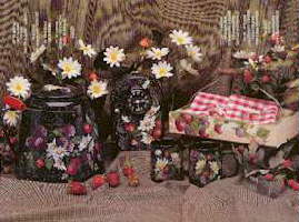 Daisies, lilacs, daffodils, poppies and hollyhocks adorn everything from
